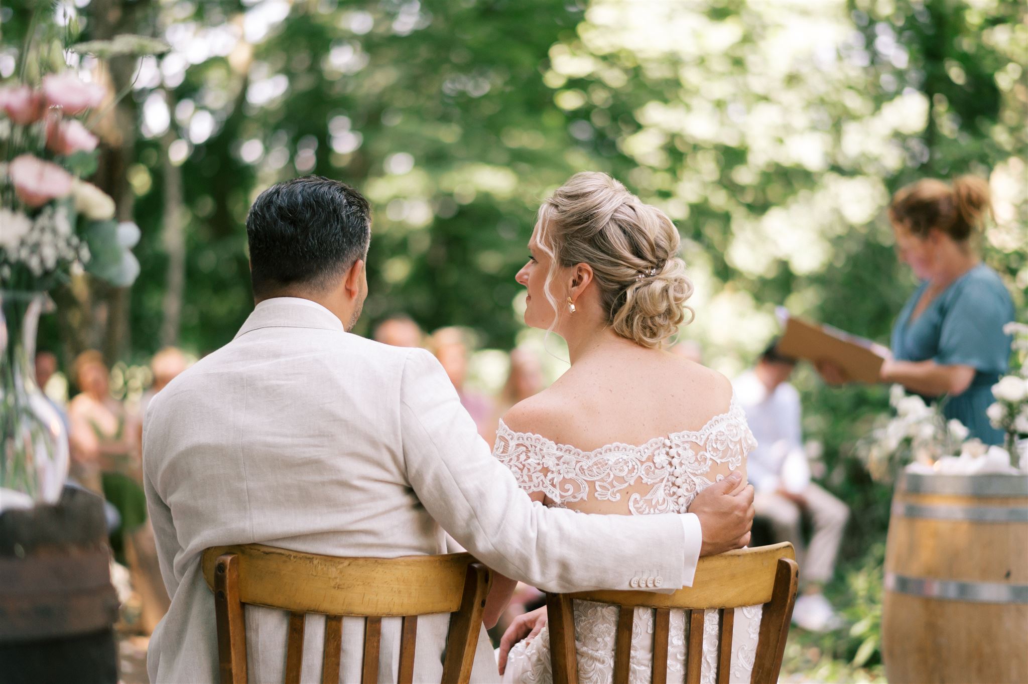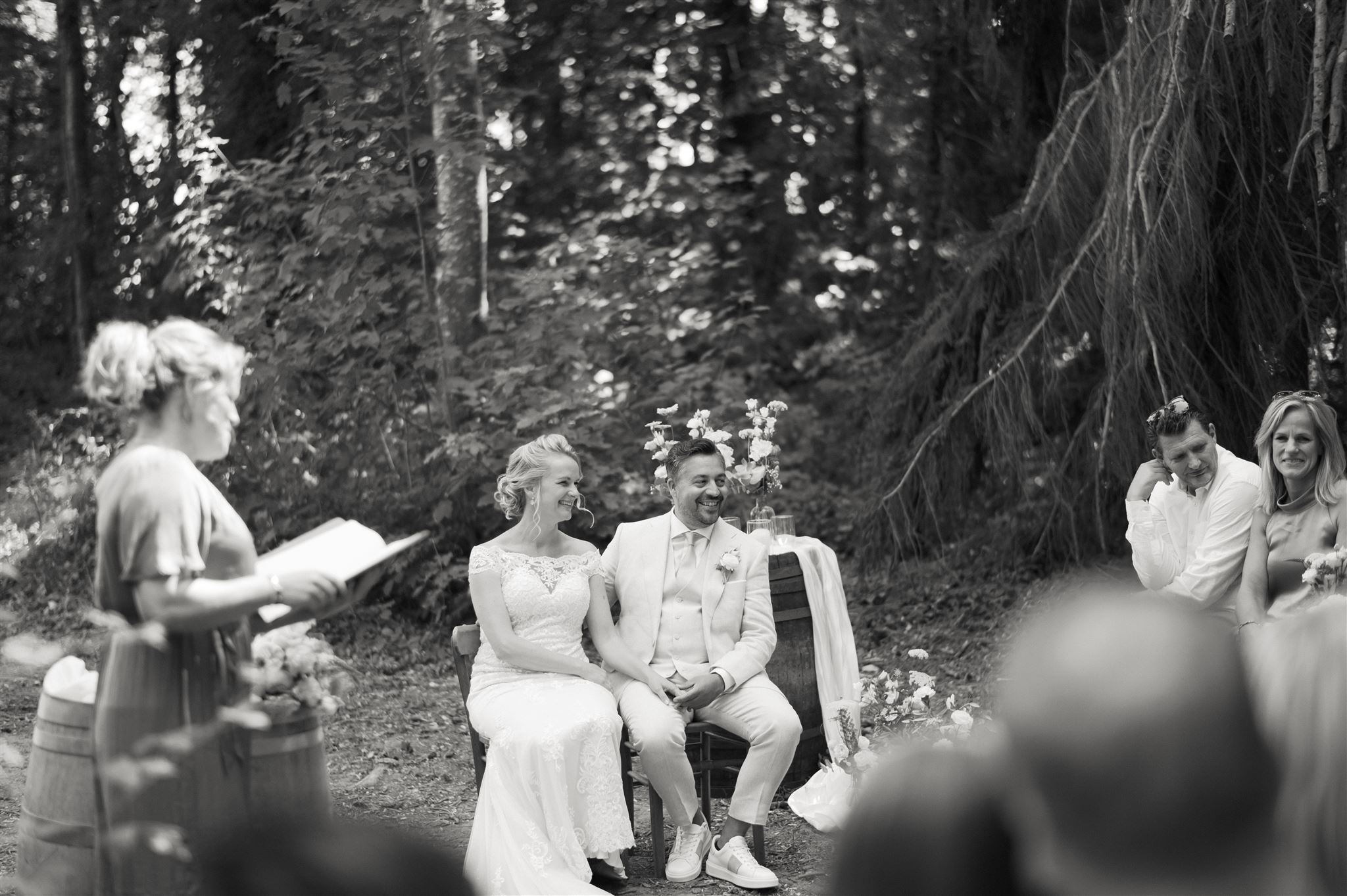 Voor ons was het een kers op de taart dat Gretha de mogelijkheid bood om ook de ceremonie te leiden. Door de klik die we voelden was dat voor ons een hele logische keuze. Ze heeft een super persoonlijk verhaal over kunnen brengen waardoor wij, maar ook onze gasten, diep geraakt werden. Om dit te kunnen doen heeft ze veel voorbereidend werk gedaan, onder andere door veel informatie op halen bij onze naasten.